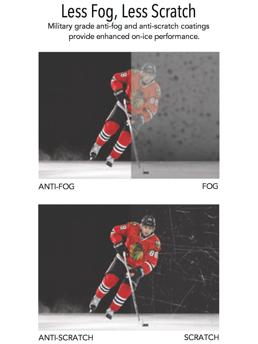 - Less Fog, Less Scratch: military grade anti-fog and anti-scratch coatings for enhanced on-ice performance